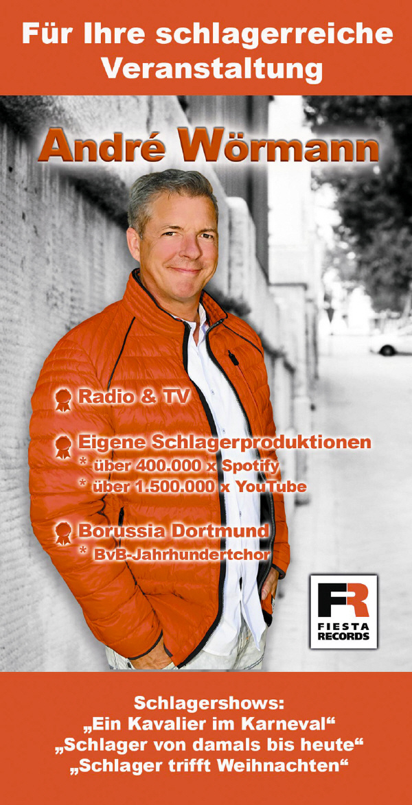 Nach 6-jähriger Musikausbildung und verschiedenen Bandformationen stehen heute seine Soloauftritte als Schlagersänger im Vordergrund. Die Erfahrungen aus über 150 Auftritten pro Jahr unterstützen André Wörmann bei der harmonischen Durchführung seiner schlagerreichen Veranstaltungen.