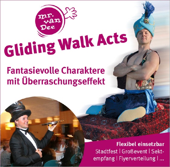 Lautlos schwebt ein faszinierendes Wesen durch das Publikum, bringt Getränke, gibt Auskünfte, verteilt Informationen. Ein eleganter Schwenk und genauso unvermittelt wie es aufgetaucht ist, entschwindet das Wesen wieder. Alles echt und zum Anfassen – aber wie ist das möglich? Mit witzig-charmantem Auftreten zaubert Mr. van Dee ein Lächeln auf die Gesichter Ihrer Gäste.