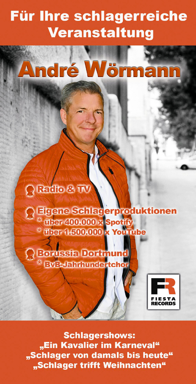 Nach 6-jähriger Musikausbildung und verschiedenen Bandformationen stehen heute seine Soloauftritte als Schlagersänger im Vordergrund. Die Erfahrungen aus über 150 Auftritten pro Jahr unterstützen André Wörmann bei der harmonischen Durchführung seiner schlagerreichen Veranstaltungen.