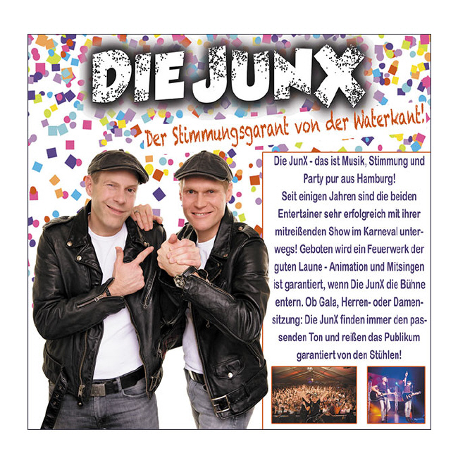 Die JunX sind mit ihrer EURODANC€ PARTY ein Garant für gelungene Events! Ob Karneval oder Oktoberfest, Kindertag oder Firmenveranstaltung, Stadtfest oder Beachparty - Die JunX begeistern jedes Mal wieder durch Spontanität und musikalische Bandbreite!