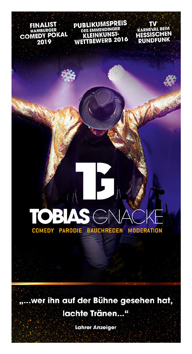 Tobias Gnacke, der Tausendsassa auf der Bühne, beherrscht die Kunst der Parodie gesprochen wie gesungen. Er haucht als Bauchredner Puppen leben ein und Menschen andere Charaktere. Zwischendurch wechselt er locker zwischen den unterschiedlichsten Musikinstrumenten, moderiert und feixt mit dem Publikum. Die Kombination dieser verschieden Showdisziplinen macht Tobias Gnacke zu einem Unikum in der deutschen Showszene.