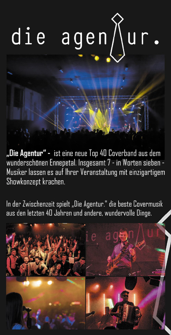In der Zwischenzeit macht "Die Agentur." die beste Covermusik aus den letzten 40 Jahren und andere, wundervolle Dinge. Manchmal so gut, dass Menschen sie lieben. Manchmal so gut, dass Menschen sie hassen. Vielleicht ist das einer der Gründe, warum zahlreiche, glückliche Kunden "Die Agentur." auf ihre liebevoll zusammengeklöppelten Bühnen lassen. Selig in einer alten Fabrikhalle zwischen Netto Supermarkt und Aral Tankstelle im wunderschönen Ennepetal residierend, ist "Die Agentur." der geistlich-umnachtete Beistand für selbstzweifelnde Eventmanager, Veranstalter, Geburtstagskinder und Neuverheiratete. Bei "Die Agentur." wird hart an der großen Show gearbeitet und gebetet für das, was wirklich zählt: Geld und Liebe. "Die Agentur." fährt den Karren nie an die Wand. "Die Agentur." fährt ihn durch. Für ihre Kunden. Für die Kunden ihrer Kunden.