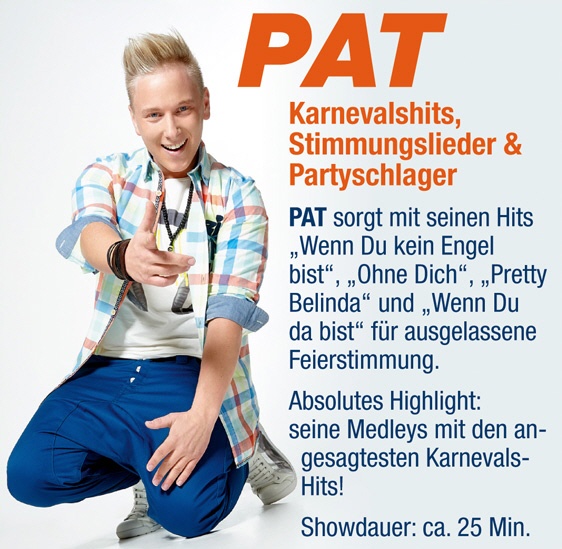 Mit seinem jugendlichen Charme und einer tollen Live-Show begeistert PAT sein Publikum mit Songs wie "Jenseits von Eden", "Bungalow in Santa Nirgendwo" und "Ich bau Dir ein Schloss" auf jeder Veranstaltung.