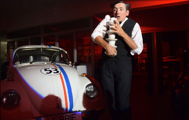 Im Laufe der Veranstaltung steigert er sich: Close-up Zauberei, Akrobatik, Slapstick, Pantomime...